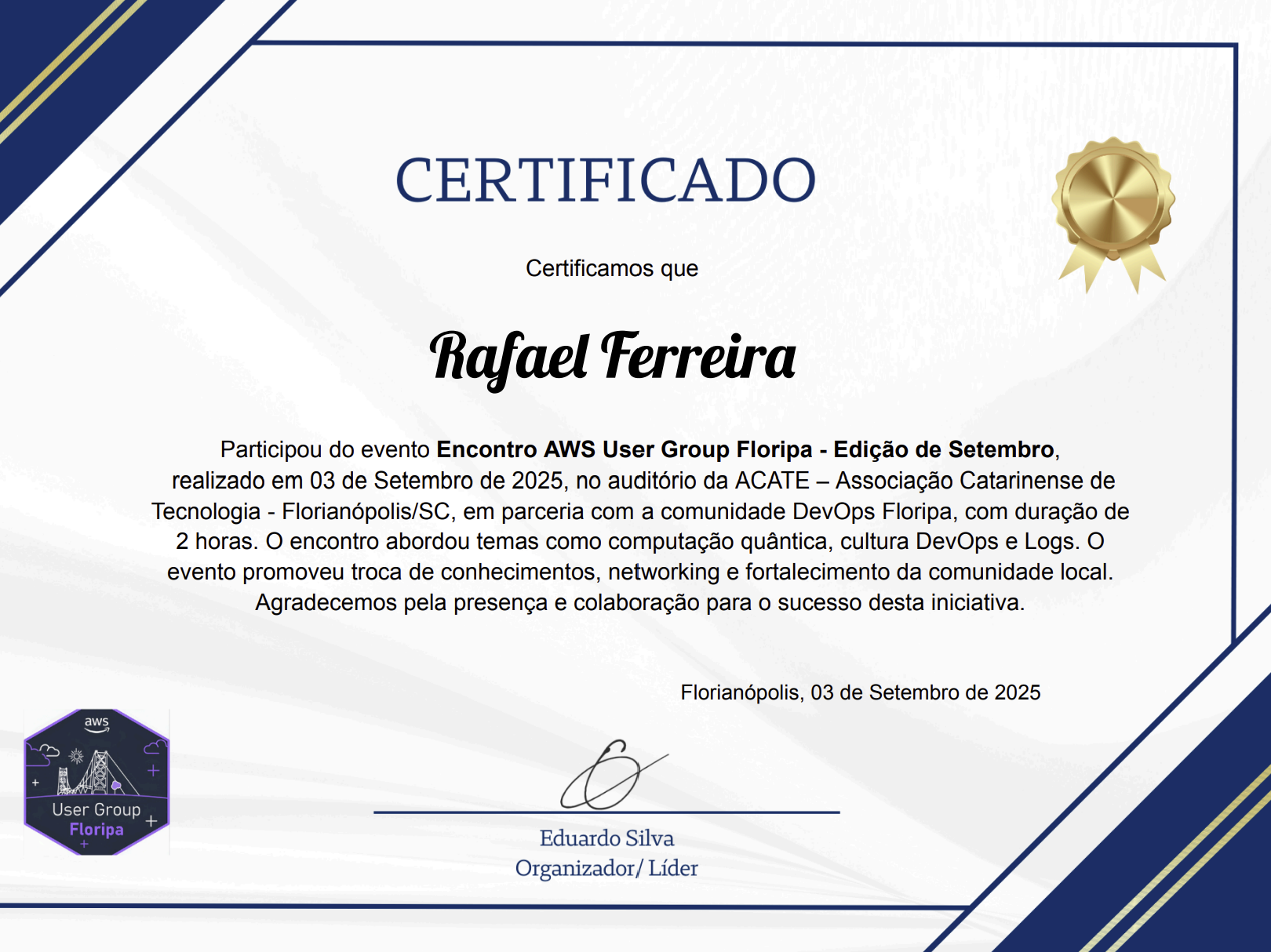 No dia 03 de setembro de 2025, participei como palestrante no Encontro das comunidades AWS User Group Floripa + DevOps Floripa, realizado no Auditório da ACATE - Passeio Primavera (SC-401).