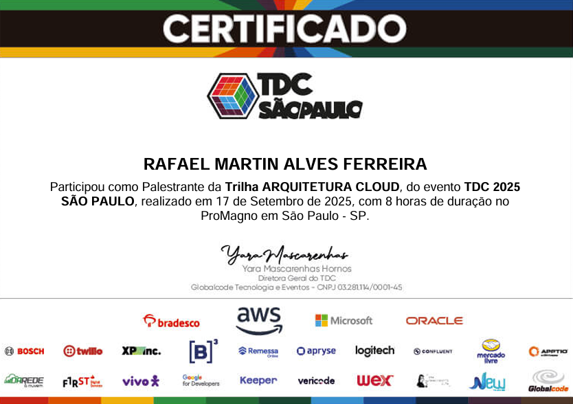No dia 17 de setembro de 2025, participei como palestrante da Trilha de Arquitetura Cloud no TDC São Paulo, um dos maiores eventos de tecnologia do Brasil, realizado no ProMagno, em São Paulo - SP.